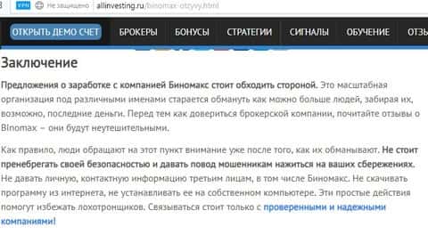 Лохотронщики из BinoMax попали под лупу даже к такому сайту как allinvesting ru. Свое популярностью в интернете и преступной деятельности, они смогли завоевать внимание многих сайтов-обзорщиков. и все они в один голос твердят, что предложения о заработке с компанией Бино Макс стоит обходить стороной. А также не стоит пренебрегать своей безопасностью и давать повод мошенникам нажиться на ваших сбережениях.