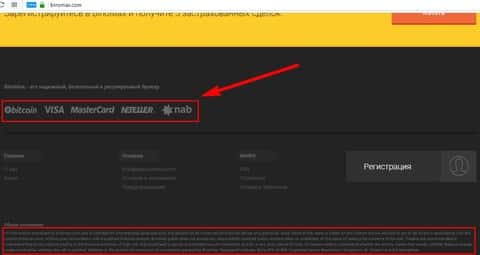 И напоследок можно обозначить, что бинарный дилер Бино Макс принимает платежи как банковскими картами, криптовалютой, так и другими платежными системами. А мы знаем, если перевести на крипто-кошелек деньги, то уже хозяина точно не найдешь и никакой чарджбек не поможет. Ниже также можем увидеть, где мошенники BinoMax, еще до совершения преступления, открещиваются от всего, что они вывалили на этом сайте.