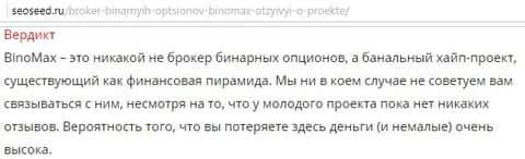 Контору Бино Макс не обошел стороной даже знаменитый интернет-проект Сеосид. Они вынесли вердикт, что BinoMax - это никакой не брокер бинарных опционов, а выступает как обычный хайп-проект с начинкой финансовой пирамиды. Зарабатывают только владельцы конторы и партнерская программа по привлечению новых лохов.