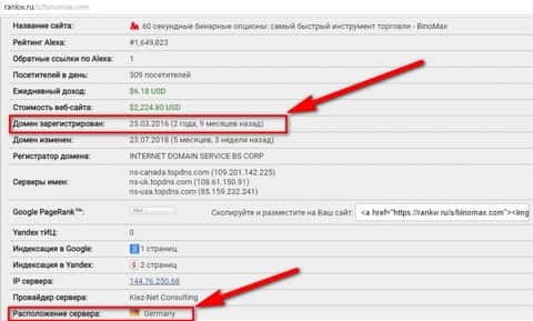 У себя на сайте конторщики из Бино Макс выложили информацию о том, что они работают с 2012 года и имеют огромнейший опыт в трейдерстве на рынке бинарных опционов. Но зайдя на сайт rankw ru мы узнали несколько интересных вещей. Оказывается домен зарегистрирован в 2016 году, при чем айпи сервера на котором хранится вся информация находится в Германии. Вот как-то совсем не клеится эта информация ни к островам Гренадин, ни к русскоязычной версии сайта, ни к австралийскому регулятору ASIC. Короче тайна покрытая мраком!