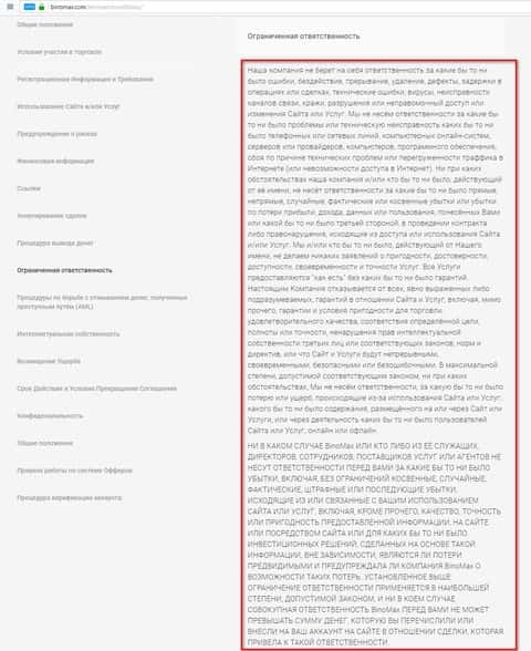 В принципе, если рассматривать договор, который предоставляет своим клиентам компания BinoMax, то можно выделить один интересный блок, который называется "Ограниченная ответственность". Так вот здесь описана вся суть проекта и стоит вам завести туда деньги, сразу же найдутся множество отмазок и причин не возвращать клиенту деньги обратно. Получается, что, подписав договор, вы становитесь заложником мошеннической деятельности конторы BinoMax и не имеете права оспаривать их действия согласно подписанного договора. Вот такая круговая порука внутри бинарной кухни на мошенническом поприще.