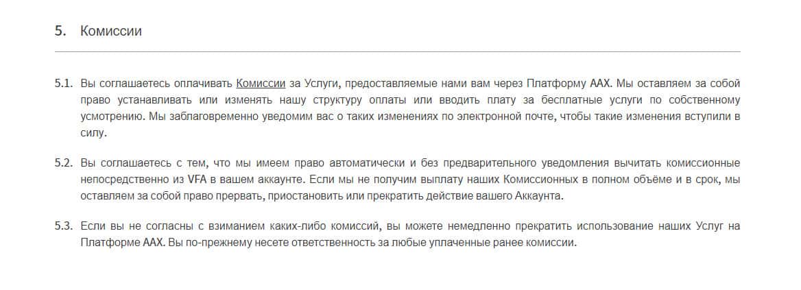 В пункте 5 контора Биржа ААХ говорит, что клиент обязан оплачивать все комиссии, которые существуют, а организация имеет право менять их по своему желанию.