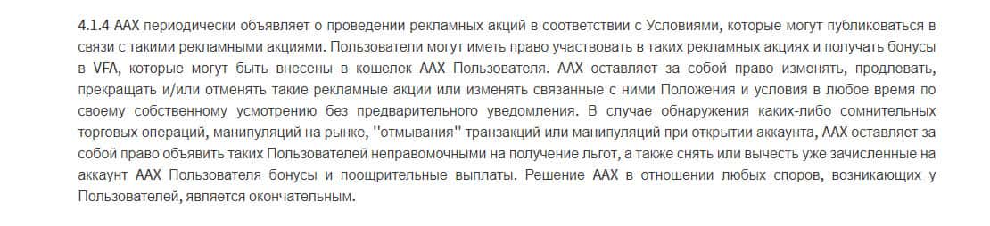 Пункт договора 4.1.4 говорит о том, что компания имеет право предоставлять клиентам бонусы. Если она уличит человека в отмывании денег, то вычитает у них бонусы и выплаты.