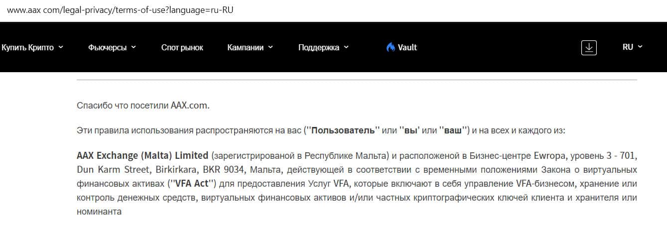 По сведениям, взятым из договора организации Биржа ААХ, юридическим лицом, выступающим от имени данной биржи, является компания AAX Exchange (Malta) Limited.
