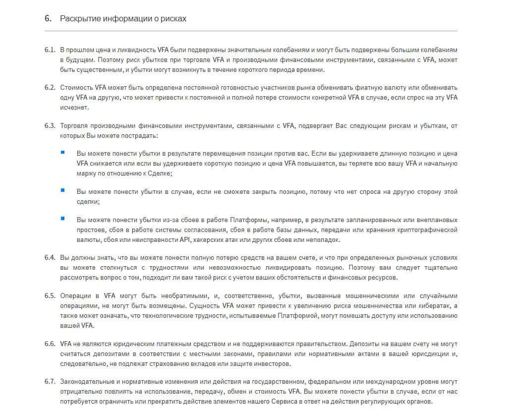 В разделе о раскрытии рисков контора Биржа ААХ уведомляет о том, что криптовалюта - высоковолатильный инструмент и клиент должен понимать, что риски здесь высоки.