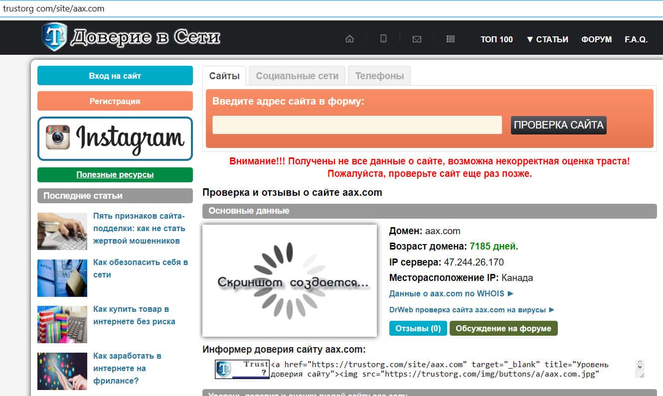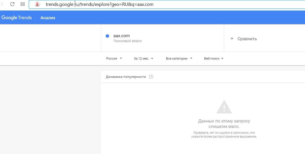 Доменное имя мошеннического сайта "aax.com" пользователи вбивали в поисковую систему Гугл слишком редко, поэтому данных по этому запросу практически нет.