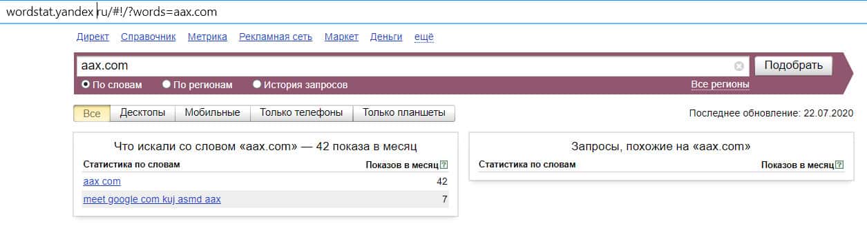 Количество запросов в поисковике Яндекс по доменному имени "aax com" без точки, не отличается от предыдущего. Результат: 42 показа за месяц.