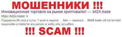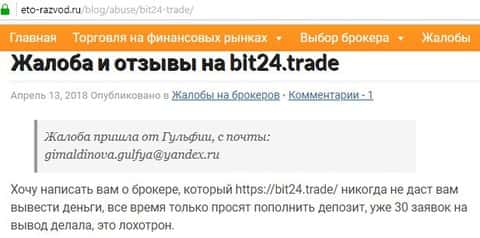 Один из сайтов, который делает обзоры об интернет-проектах по заработку, сделал краткий анализ дилинговой кухни Bit 24 Trade. Как оказалось мошенники кинули уже не мало своих клиентов и ни в коим случает не могут быть рекомендованы другим участникам рынка. В одном только заключении, можно посмотреть отзыв о данной конторе и принять правильное решение, что аферисты Бит 24 трейд обманывают людей.