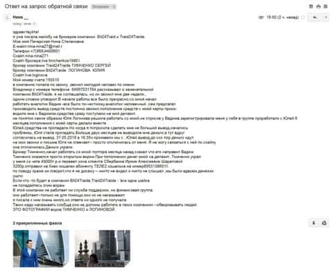 А следующих героев жулье Бит 24 трейд обрабатывало психологически для более эффективного облапошивания. Шулера, используя свои методики, буквально насильно заставили отправить им деньги и следовать в торговле советам аналитиков. Понятно к чему это все привело, но не каждый человек может справиться с таким напором. Как бы странно это не показалось, но шарлатаны совершили уголовное преступление и должны быть наказаны.