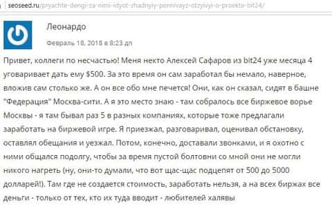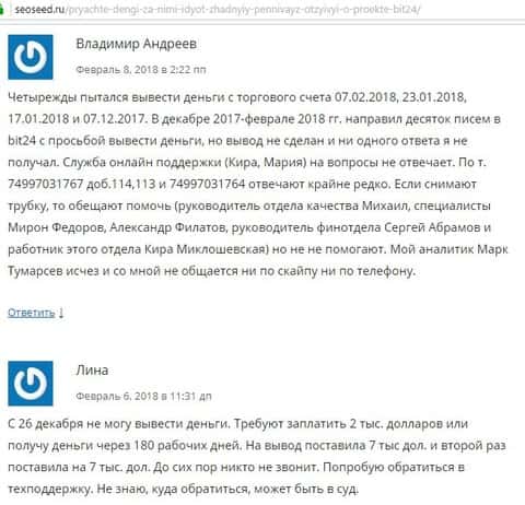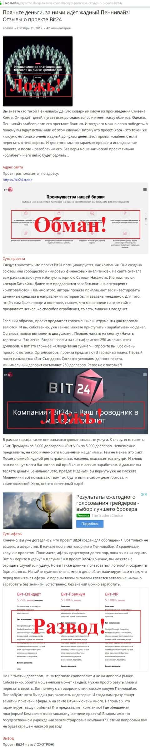 Следующий обзорщик под названием сеосид ру такого же мнения как и его предшественник. Обзор коснулся самых важных деталей и показал, что дилинговая контора Bit 24 Trade очень жадная к чужим деньгам и какой бы сайт не был хорошим, это ничто в сравнении с наглым враньем, которое на сайте на каждой странице. И вообще компания оставляет впечатления хайпа и кухонного брокера на который может повестись только самый далекий лох.