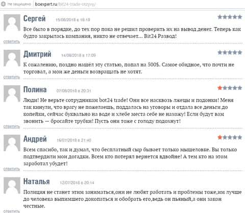 Согласно информации на одном информационном ресурсе, который занимается обзором сайтов, компания Бит 24 трейд не заслуживает доверия. Во первых она имеет отрицательный уровень траста, что сразу настораживает нас вкладывать туда деньги. Есть даже несколько негативных отзывов, которые подтверждает наши слова, что контора Bit 24 Trade - мошенники.