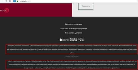 И здесь в самом конце титульной страницы описаны мелким шрифтом риски, которые принимает на себя клиент, который хоть каким-то образом свяжет свою инвестиционную деятельность с кухней Бит 24 трейд. Жулики предупреждают, что клиент может потерять все деньги и будет отвечать за эту сам и неважно кто приложил к этому руку.