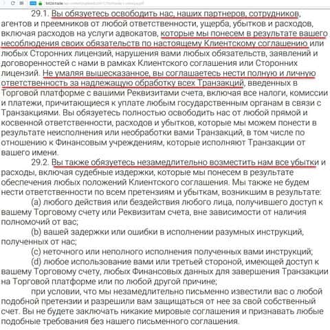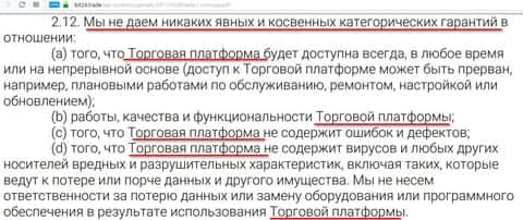Какой интересный пункт был найден в Клиентском соглашении дилиновой конторы Бит 24 трейд. Согласно ему, компания не дает никаких явных и косвенных категорических гарантий в отношении торговой платформы. Все косяки и проблемы с которыми столкнется клиент, лежит полностью на плечах у клиента. Даже если вдруг платформа заглючит и вы потеряете все деньги, то виноваты будете тоже вы, так как договор уже подписан.
