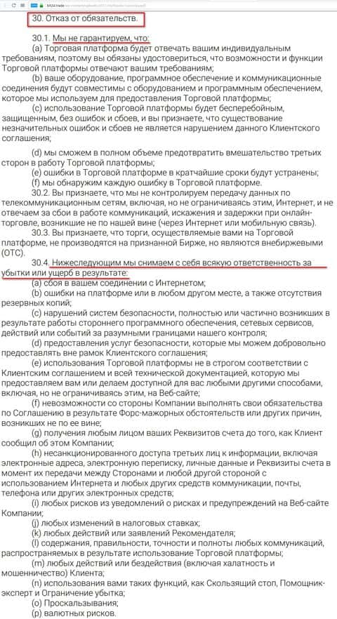 Еще одним разделом Клиентского соглашения, контора Бит 24 трейд снимает с себя полную ответственность за все свои действия и недочеты и возлагает это бремя на плечи пострадавшего клиента. Есть такой раздел как Отказ от обязательств, так вот он и ставит в конце жирную точку во всех разбирательствах и в случае судебного иска, мошенники увильнут от приговора, ссылаясь на этот скользкий раздел.