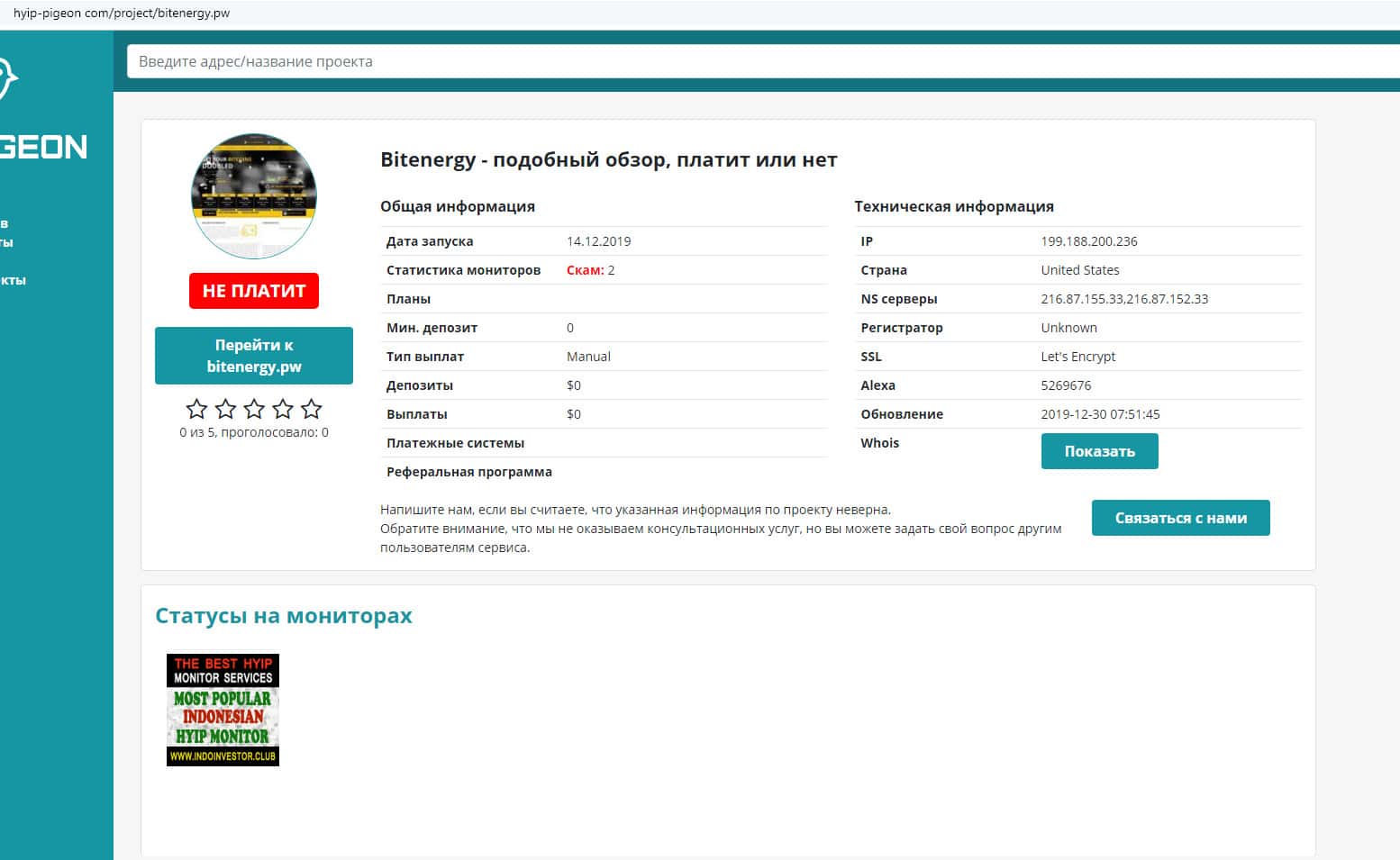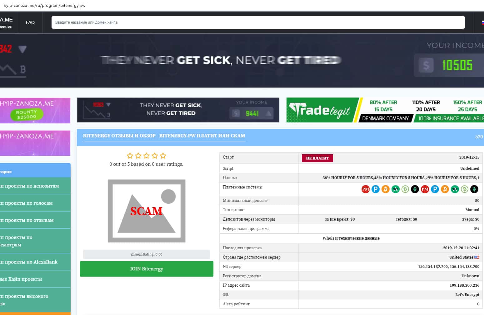 На веб-сервисе hyip-zanoza me статистика о BitEnergy говорит о том, что данный хайп-проект вообще не платит своим клиентам, а получается, что он у них ворует деньги. Эта мошенническая кухня ещё использует смену домена. Что-то вроде то был совсем другой сайт и мы тут ни при чём, только владельцы вот одни и те же.