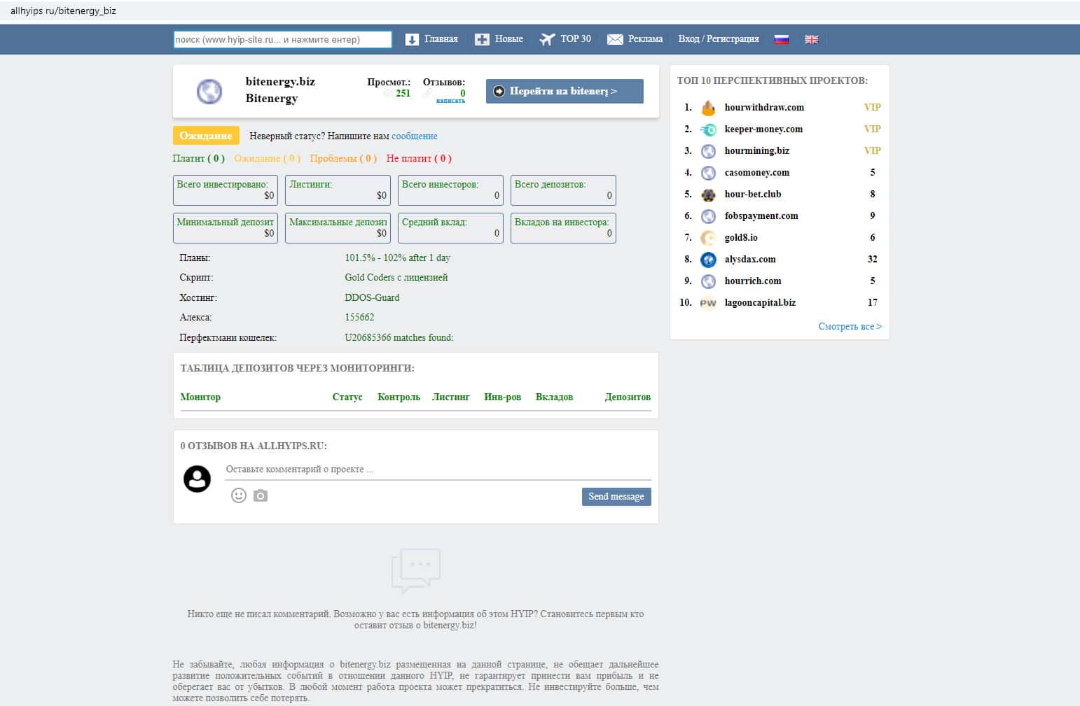 На сайте allhyips ru просмотрели страницу с Бит Энерджи 251 человек, при этом ни один не оставил какой-либо отзыв. Кажется, честная контора Бит Энерджи делает всё, чтобы в сети не было отрицательных отзывов о её работе, ведь это по-настоящему мошенническая схема для наивных пользователей интернета.