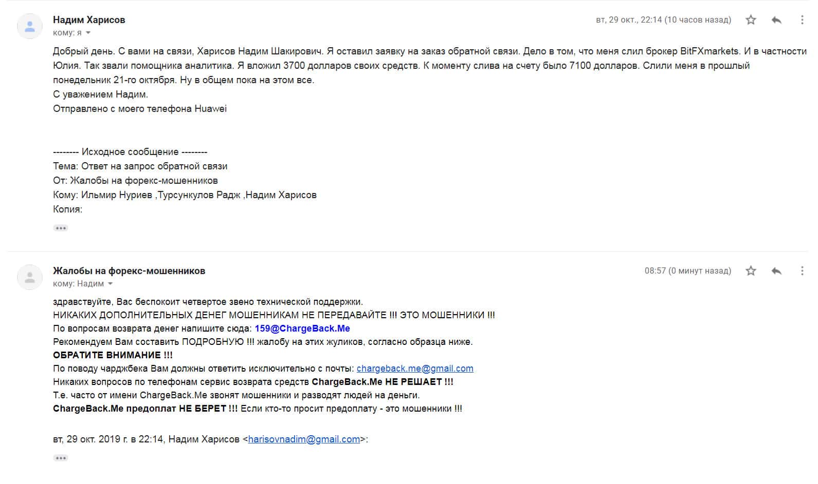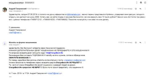 Клиент сразу же написал письмо в организацию ChargeBack.Me с просьбой о помощи, как только попался на удочку к аферистам Бит ФХ Маркетс. Он вложил туда порядка 200 долларов, но когда стал читать реальные отзывы об этой шараге, то ужаснулся, так как понял, что больше никогда не увидит своих денег.