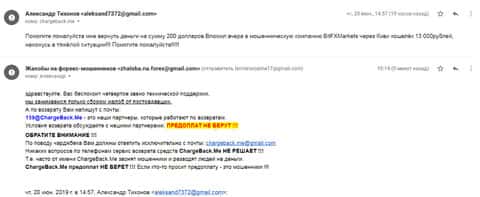 Несколько сотен американских долларов не отдают и автору следующего информационного материала в виде жалобы на кухню БитФХМаркет. Этому пострадавшему пользователю всемирной сети также посоветовали обращаться к ChargeBack.Me за помощью.