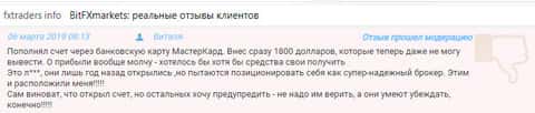 Вот еще один отзыв, на этот раз с сайта фхтрейдерс инфо. Аферистам BitFXMarkets удалось расположить клиента к себе, и он внёс на счет в конторе также нехилую сумму в 1800 долларов. Это и нужно было мошенникам. После того, как деньги клиента оказались у них, сам клиент уже больше мошенникам был не интересен, ведь нужны им от него были только деньги!