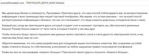 Помимо водянистой и стандартной главной страницы, мошенники также предлагают своим клиентам интересные возможности. Например, программа "Приведи лоха", ой, то есть "Приведи друга", взятая прямо с учебника любителей финансовых пирамид. Мошенники Бит ФХ Маркетс ищут лохов как только можно, а также заставляют их приводить друзей. Что ж, браво.