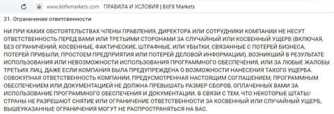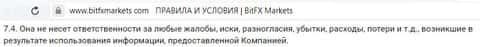 Подставив организацию, не имеющую к BitFXMarkets никакого отношения, жулики все равно не остановились. Так, они снимают с себя ответственность за использование клиентом информации. Якобы убытки у ущерб, вызванный использованием данной информации, лежит целиком на клиенте, и сейчас вы в полной мере осознаете, какого рода именно это убытки.
