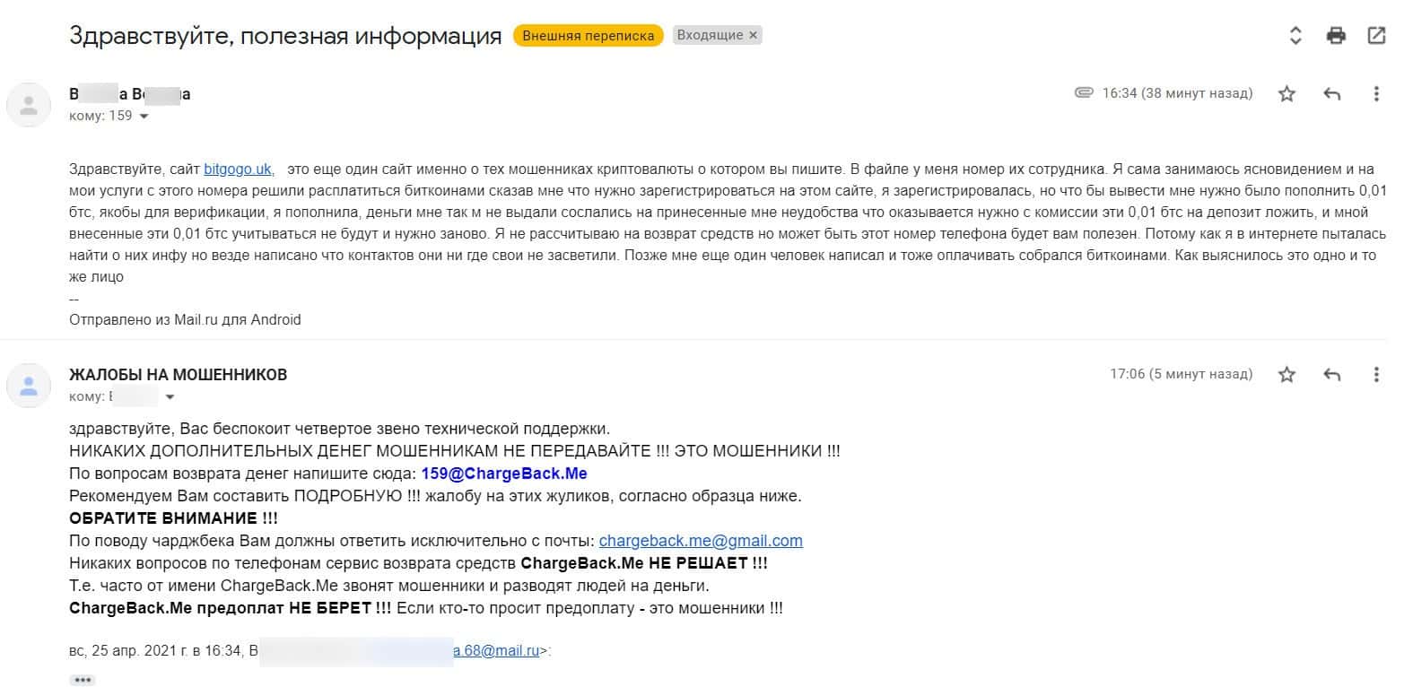 Фирма кидал Бит ГоГо не представила контактного номера телефона, а указала лишь адрес электронной почты, где поддержка лохотрона разводит наивных пользователей. Почта кидал: