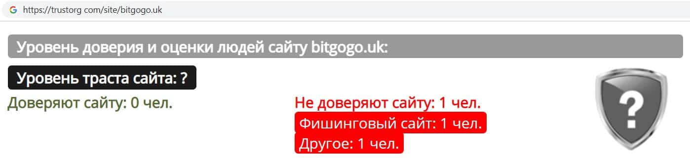По данным интернет-ресурса "Доверие в Сети", компания мошенников BitGoGo Uk имеет отрицательный уровень доверия пользователей, что говорит о плохой репутации компании.
