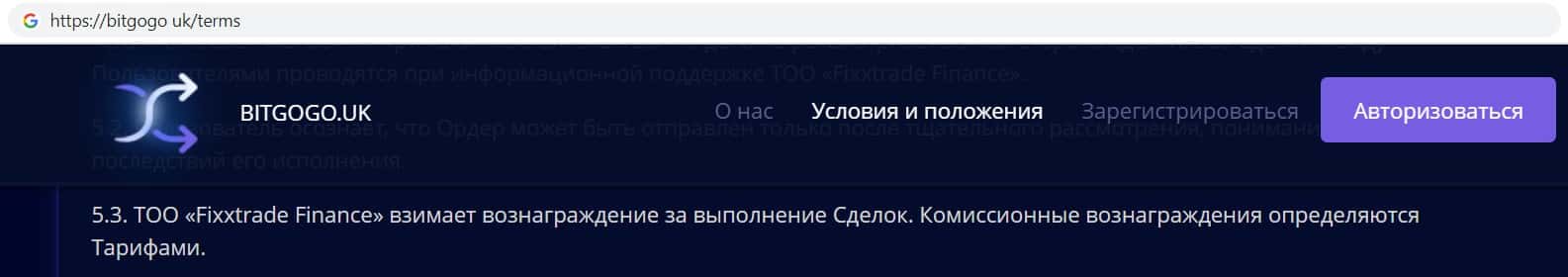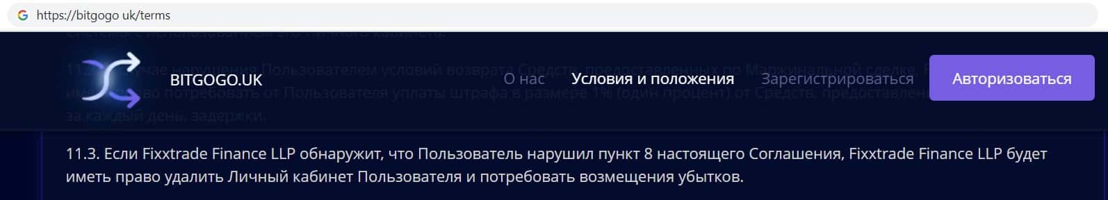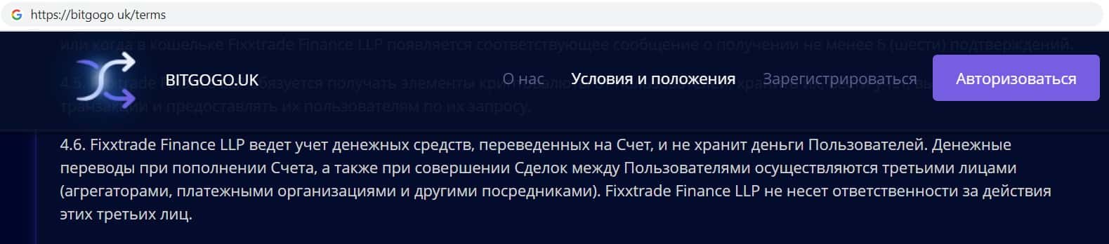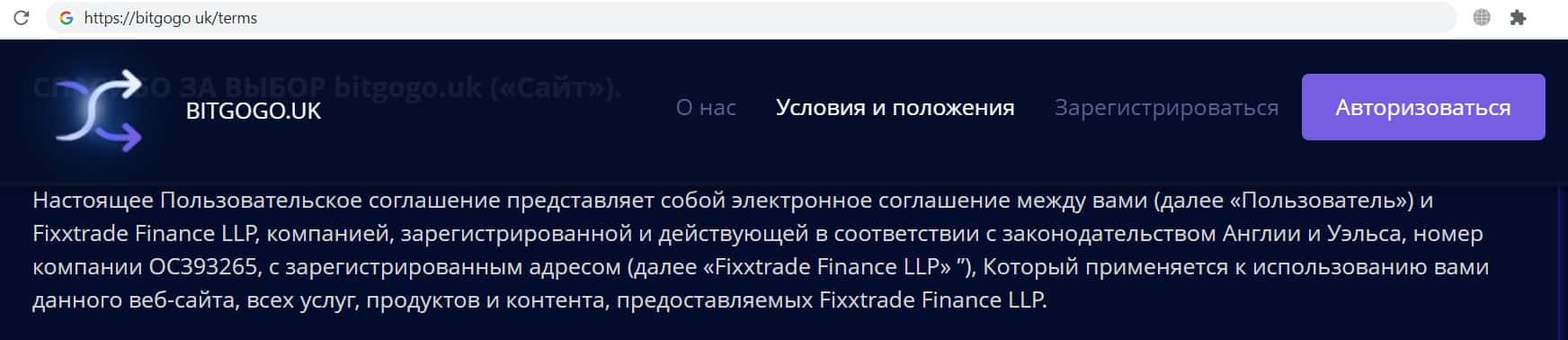 Мошенническая фирма Бит ГоГо предоставила на своём сайте информацию о своём юридическом лице, которым в свою очередь является компания Fixxtrade Finance LLP.
