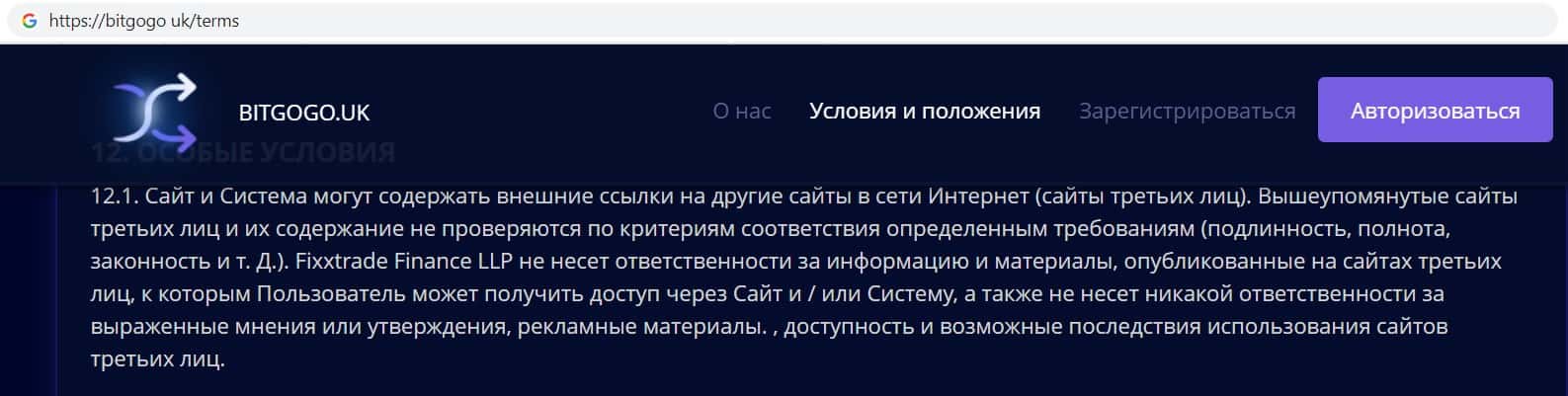 Ещё лохотрон BitGoGo Uk указал, что на главном сайте жуликов могут быть ссылки на сторонние сайты, но контора кидал не несёт никакой ответственности за содержание сайтов.