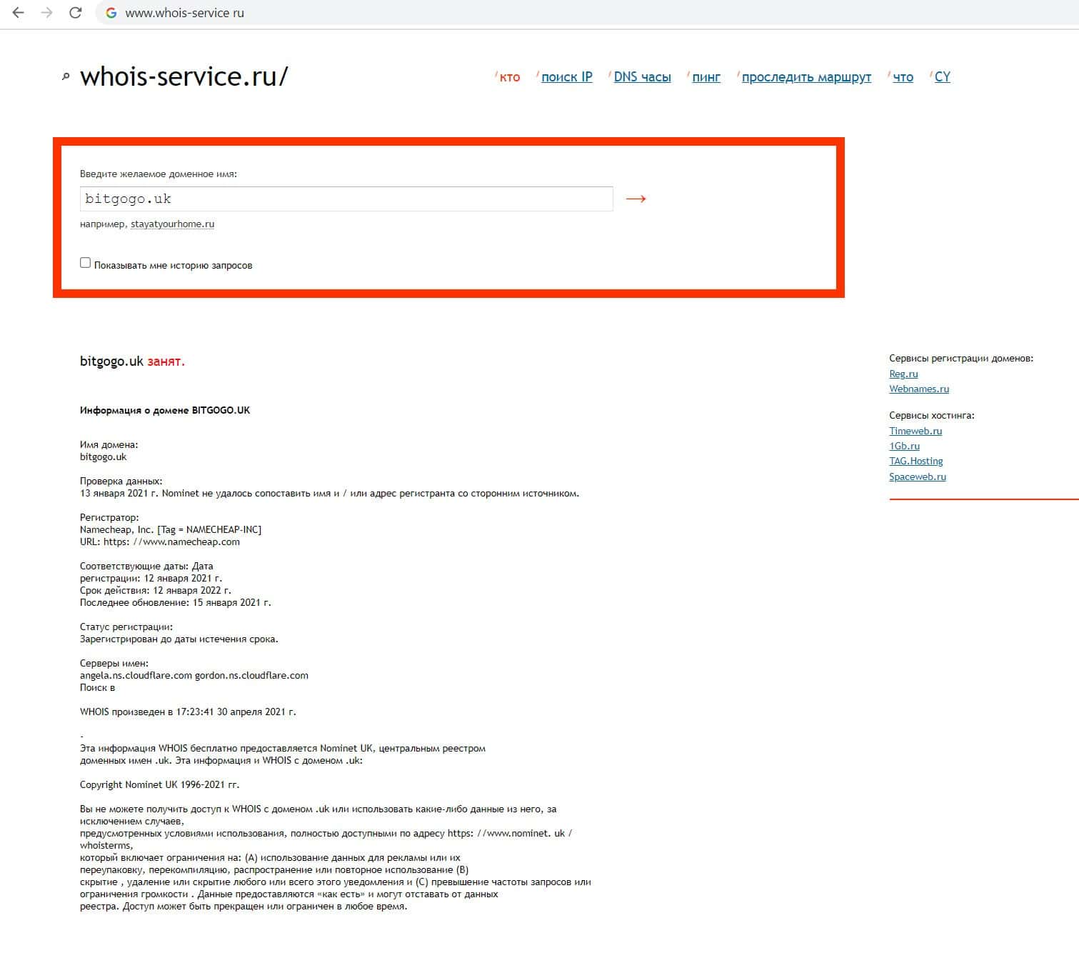 Чтобы узнать владельца доменного адреса конторы кидал Бит ГоГо мы использовали сайт whois-service ru. Оказалось, что мошенническая организация скрывает данную информацию.