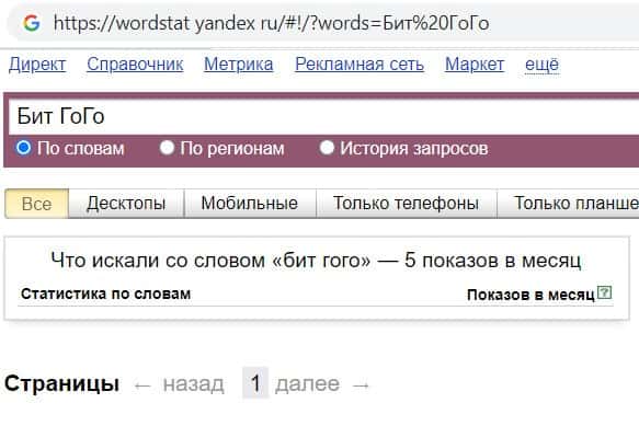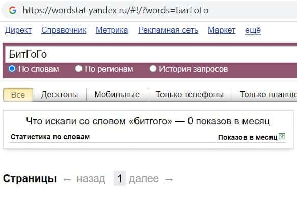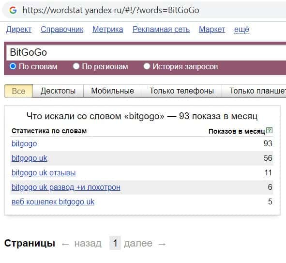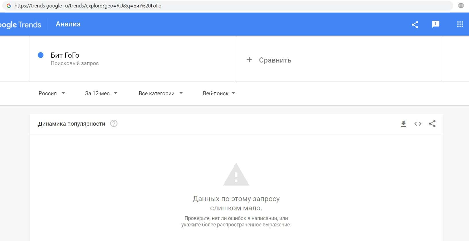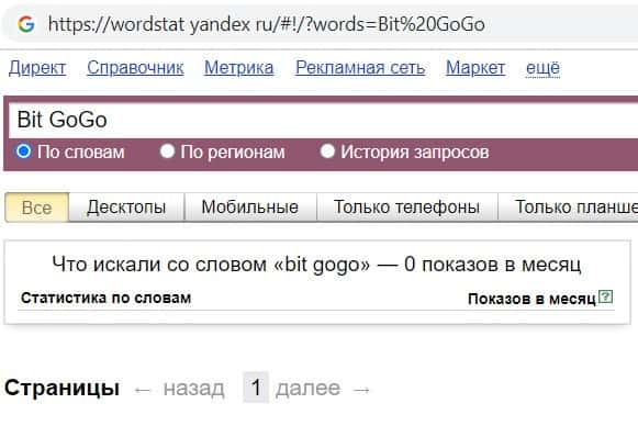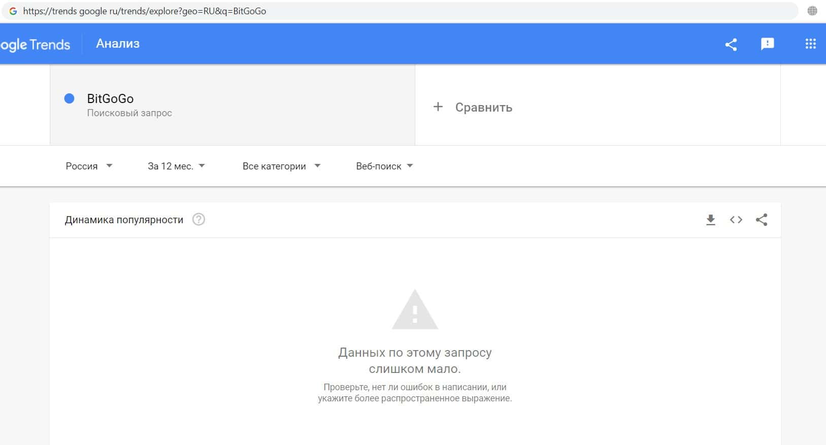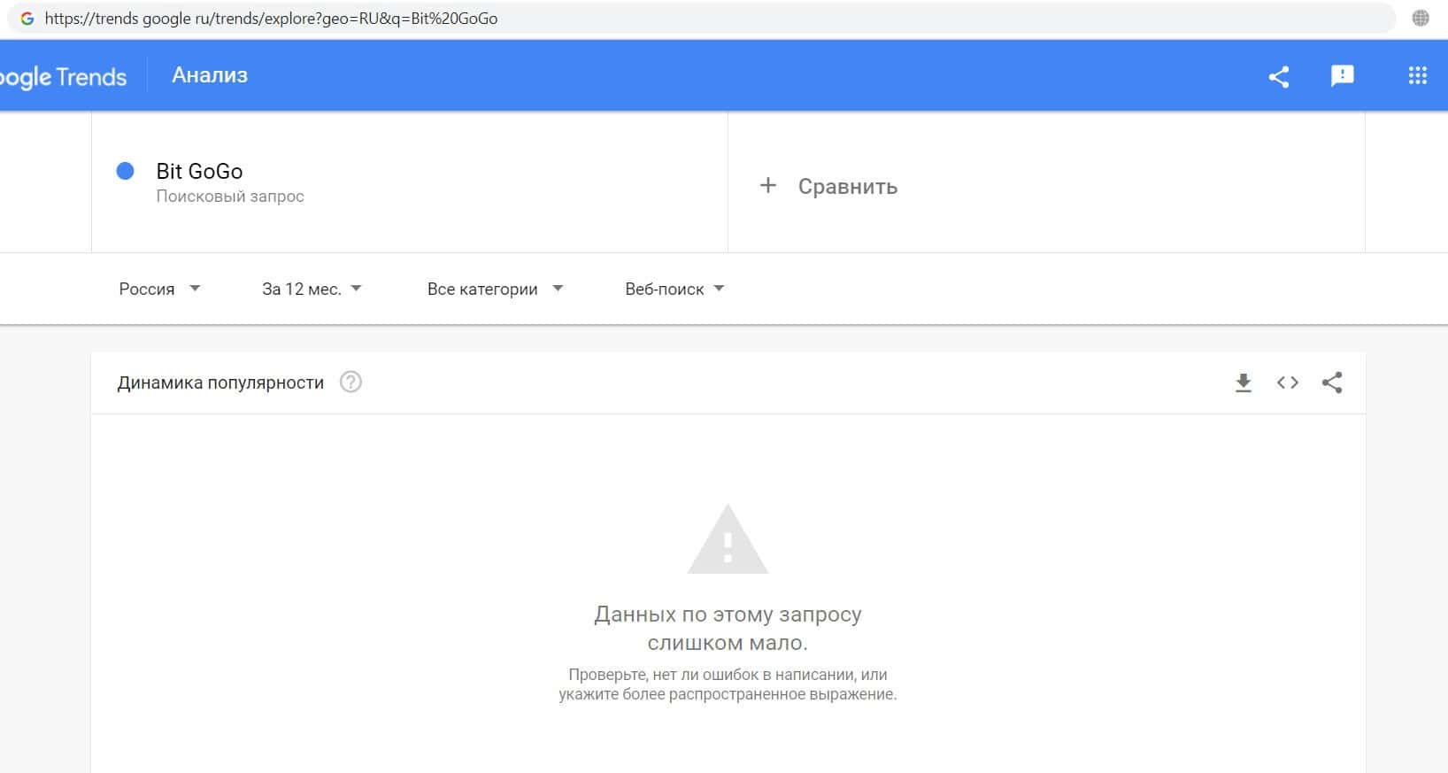 Проверили мы и количество запросов конторы разводил BitGoGo Uk по русскоязычному названию а именно "Бит ГоГо", но даже этот запрос пользователи не совершили.