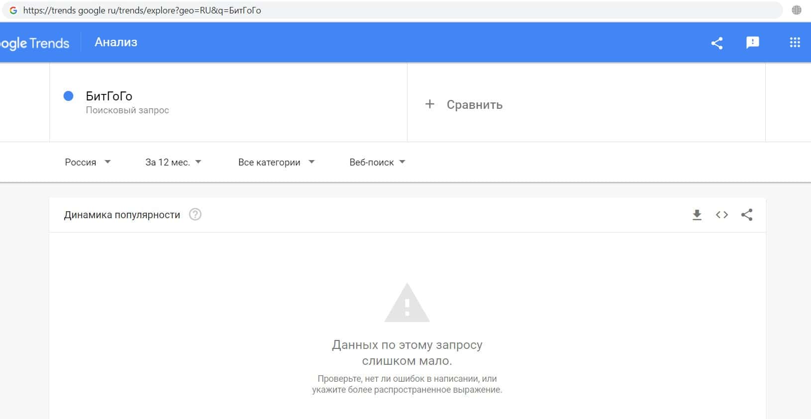 Напоследок мы проверили количество запросов мошеннического проекта Бит ГоГо в Google по домену с точкой, а именно "bitgogo.uk", но даже этот запрос пользователи не выполняли.