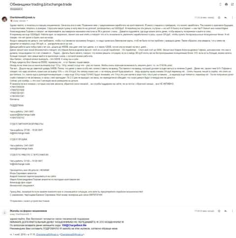 - после чего ни собственных вложений, ни тем более обещанных заработков клиент не увидел, столкнувшись с полным игнорированием ее телефонных звонков и сообщений этими явными жуликами рынка Форекс, работающими под видом брокера Бит Х Чейнж.