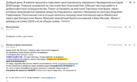 Вся ситуация произошла по неосторожности человека, так как лохотрон Бит Х Чейнж обворовала его на 2500 долларов. Жертва все так не оставил и на форуме увидел куда обращаются в таком случае кинутые клиенты. Он сам попробовал испытать счастье, написав все подробности в службу ChargeBack.Me