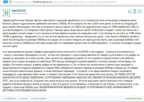 Еще одна жертва мошенничества, пострадавшая на Форекс от рук аферистов Бит Х Чейнж делится информацией о жульнической деятельности данного лохотрона, с которой столкнулась и она, потеряв как минимум 1 тысячу долларов США. Также стоит выделить момент связанный с желанием мошенников зайти в личный онлайн-аккаунт Сбербанка.