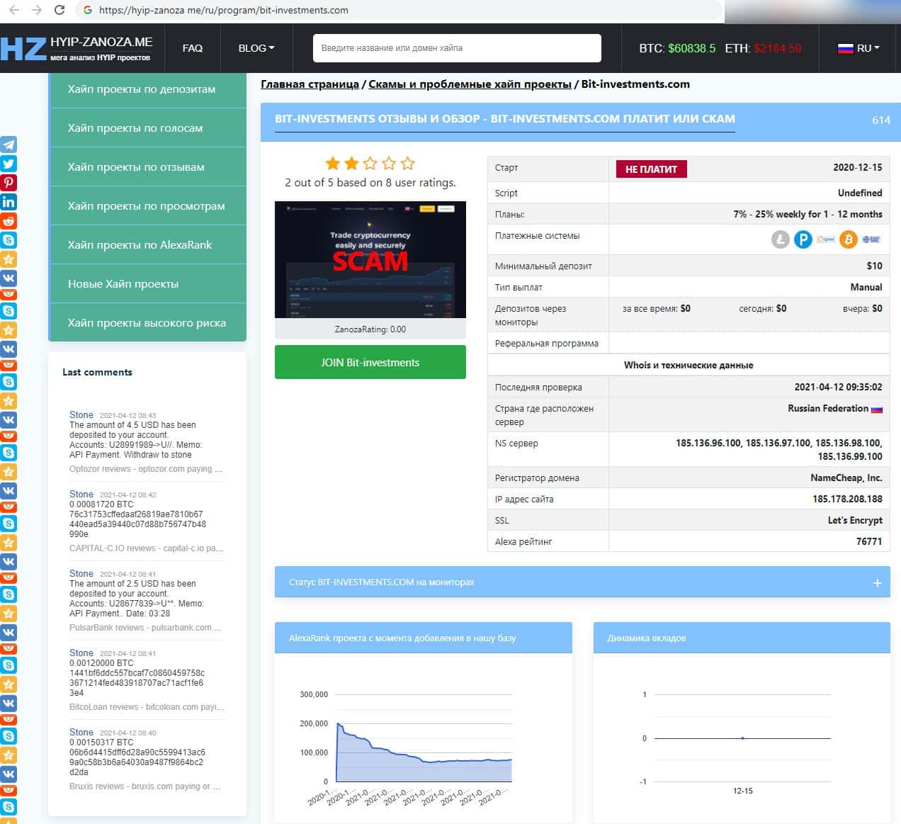 Согласно данным с известного интернет-ресурса hyip-zanozа me, жульнический веб-проект Бит Инвестментс получил весьма низкую оценку 2 из 5-ти возможных.