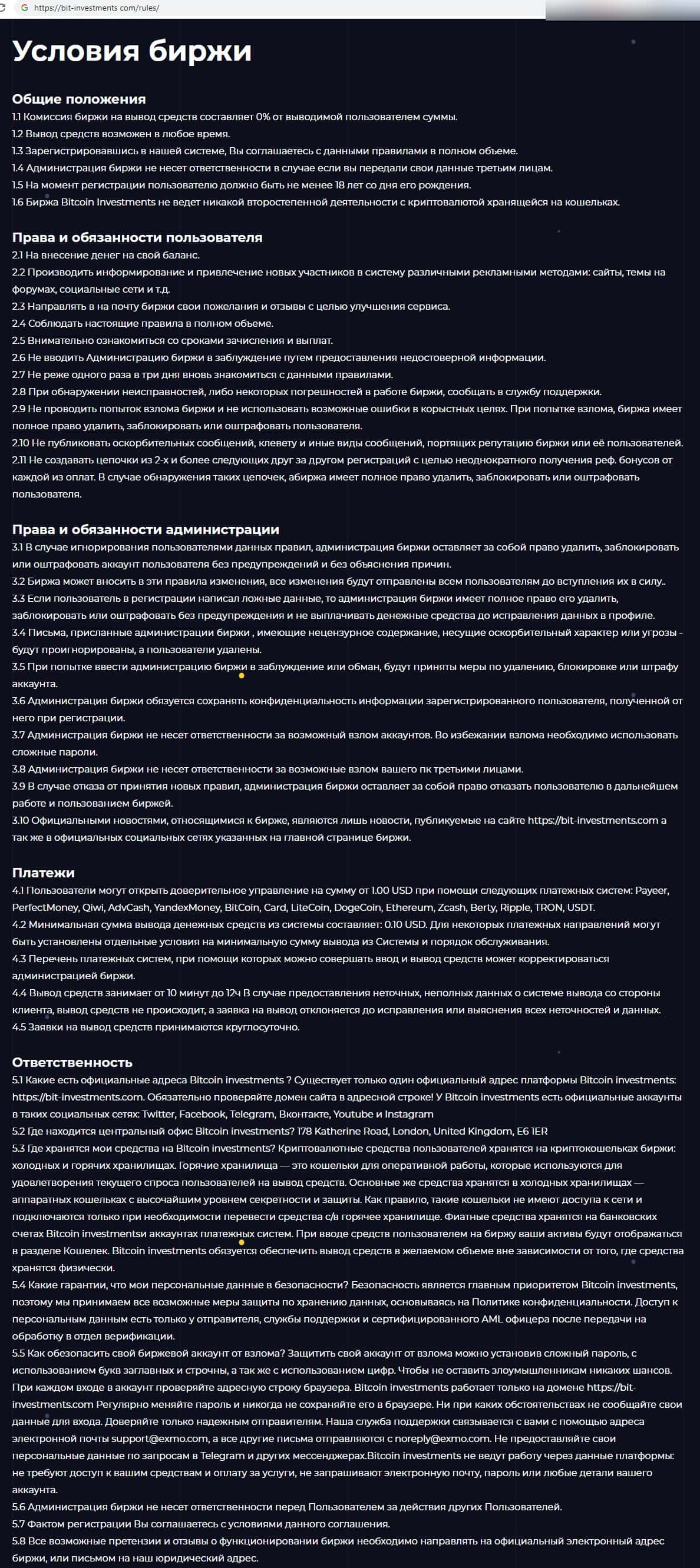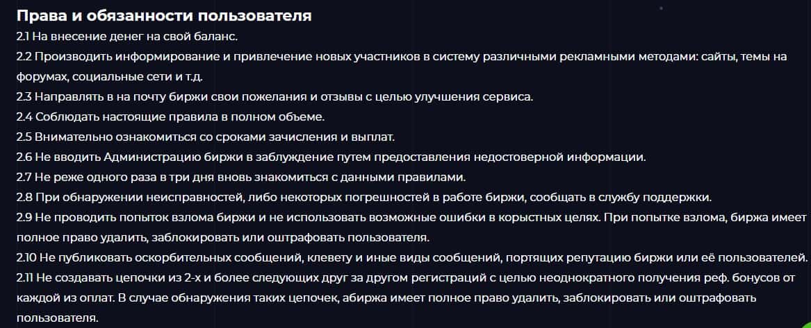 В разделе 2 "Права и обязанности пользователя" договора перечислены основные моменты, которые ворюги из Бит Инвестментс незаконно вымогают от наивных трейдеров.