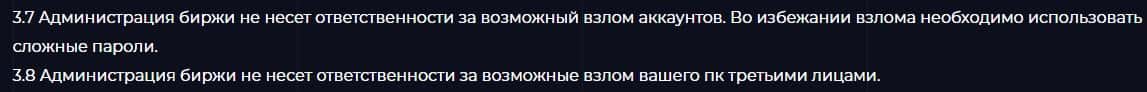 Пункты 3.7.-3.8. договора посвящены тому, что Бит Инвестментс не несет никакой ответственности за возможный взлом аккаунтов, возложил всю ответственность на трейдеров.