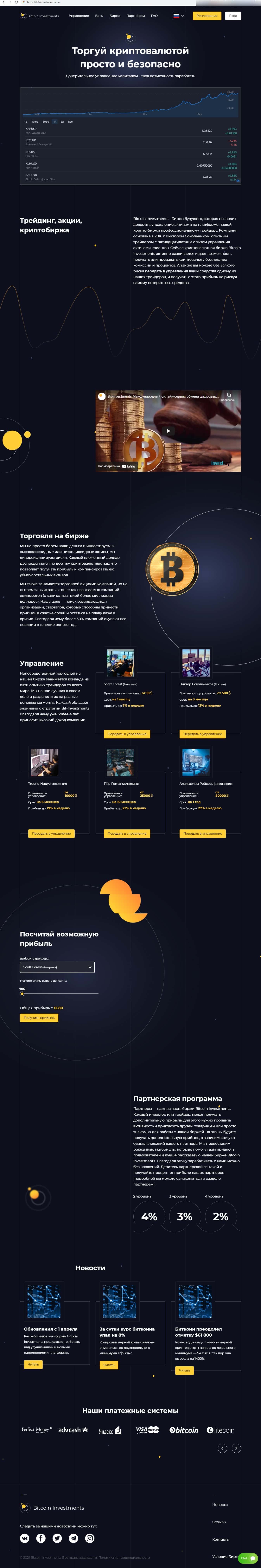 Главная страница фальшивого криптовалютного центра Бит Инвестментс