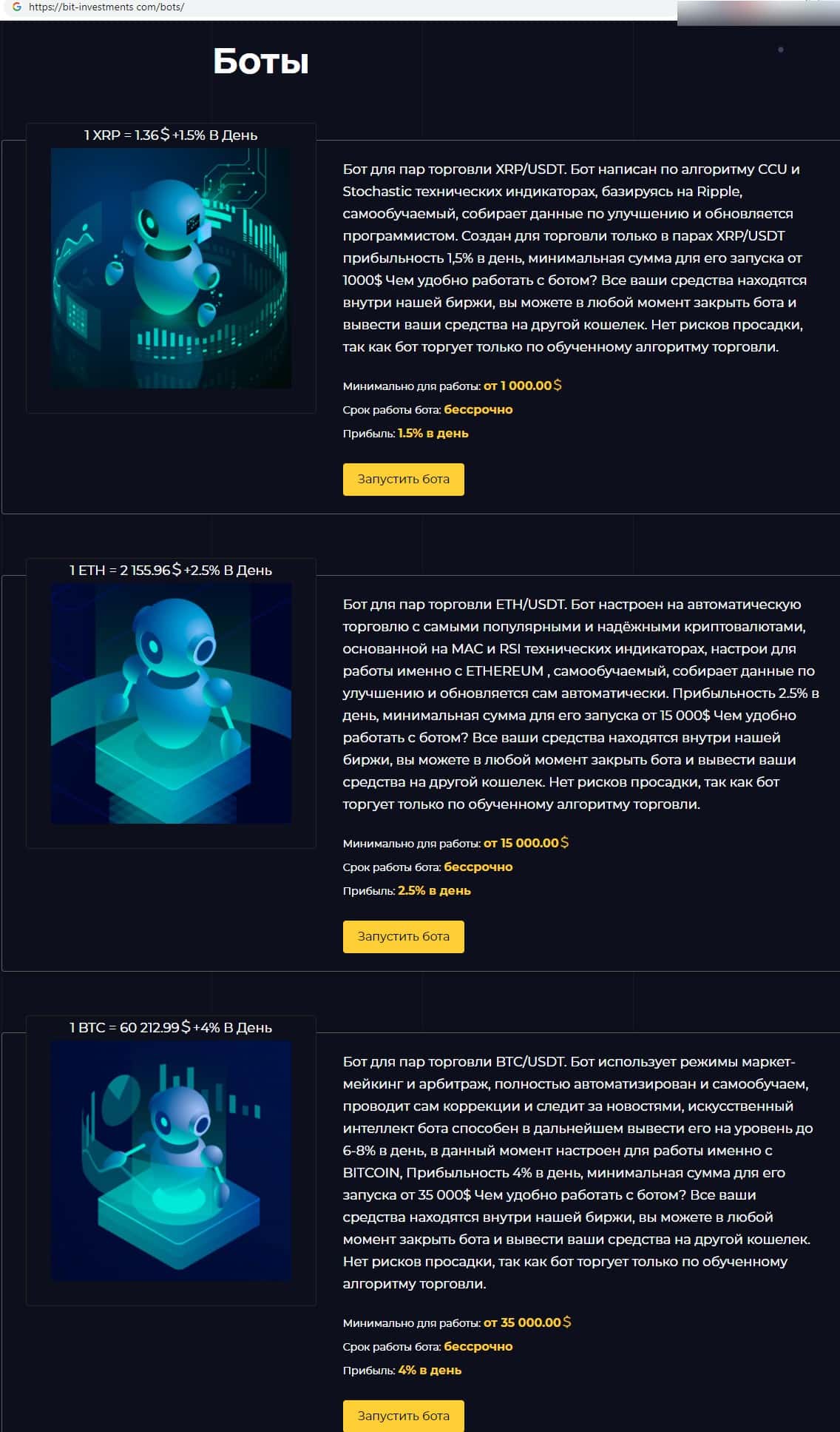 - Типы ботов, предоставляемые шарлатанской хайп-организацией Bit Investments