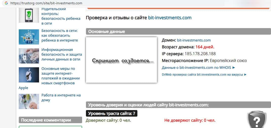 Согласно данным с уважаемого портала трусторг кам, возраст домена Бит Инвестментс составляет 164 дня с расположением в Европейском Союзе. Слишком малый срок для доверия.