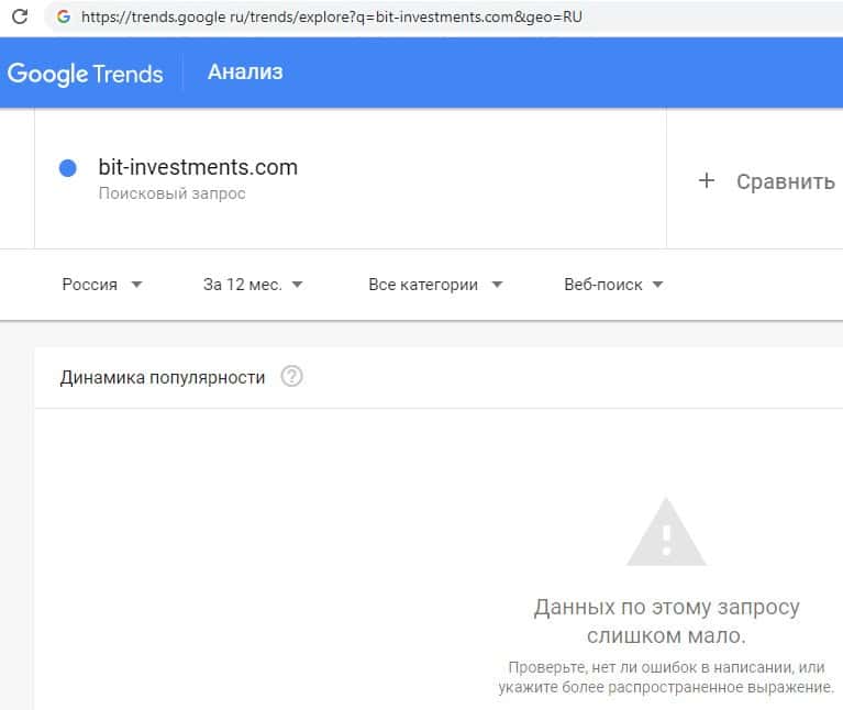 Что касается доменного имени "bit-investments.com" на английском языке, написанного с точкой, вообще не предоставил ни единого результата по поиску на веб-площадке Гугл Трендс.
