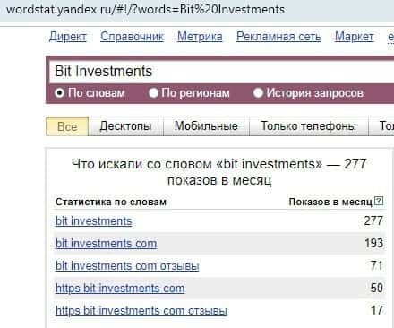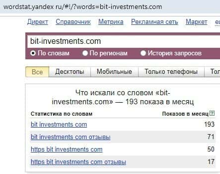 Количество запросов по брендовому имени "bit-investments.com", написанного с точкой на английском языке, по данным веб-ресурса wordstat yandex ru, равняется значению: 193 показа.