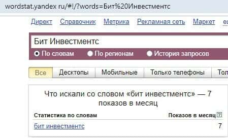 Русскоязычный вариант доменного имени "Бит Инвестментс", вбиваемого с пробелом в поисковой системе Яндекс.Вордстат, набрал в общей сумме 7 показов по запросам за месяц.