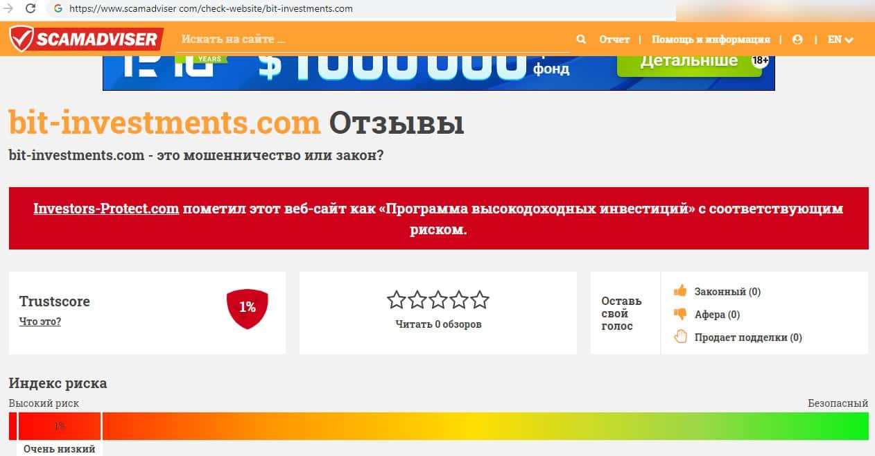 Информация о шулерской криптовалютной бирже Бит Инвестментс на веб-сервисе scamadviser com