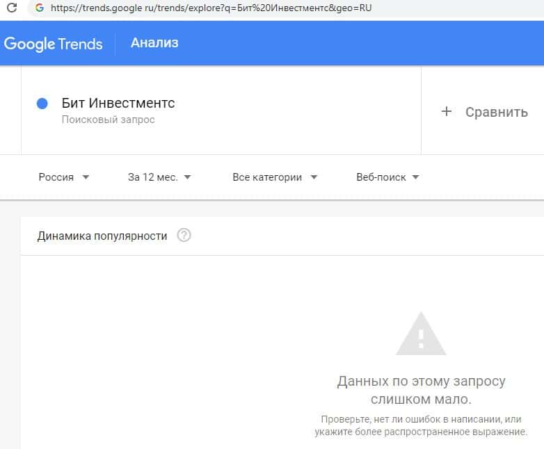 Далее попробуем совершить поиск в системе Гугл Трендс брендового имени на русском языке с одним пробелом "Бит Инвестментс". Ответ такой же, слишком мало запросов.