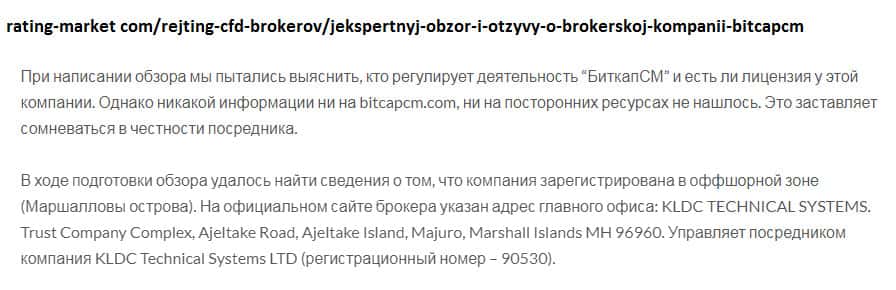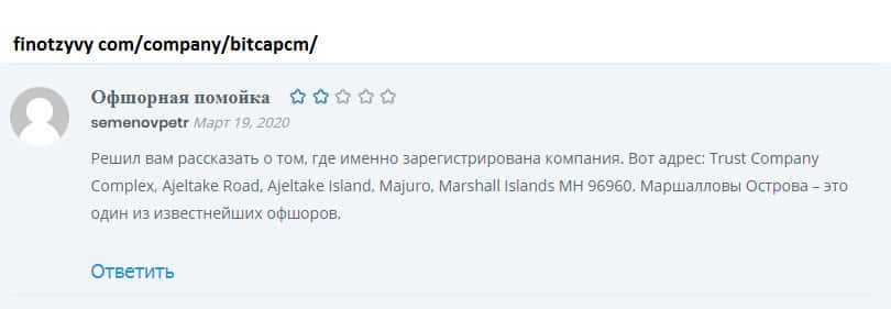 Оффшорная регистрация недоброкера Бит Кап СМ вызывает кучу смутных сомнений!