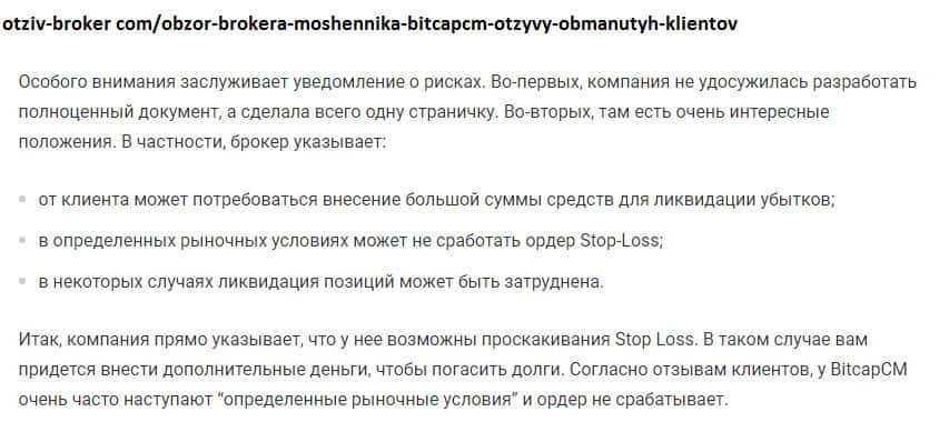 Мошенническая организация Бит Кап СМ разработала свое уведомления о рисках, которое вместилось всего на одной странице! Это нельзя назвать полноценным документом! Главный подвох уведомления, то что при определенных рыночных условиях не срабатывает ордер Stop Loss! Это определенно говорит о том, что жулики собираются своего клиента развести и кинуть!