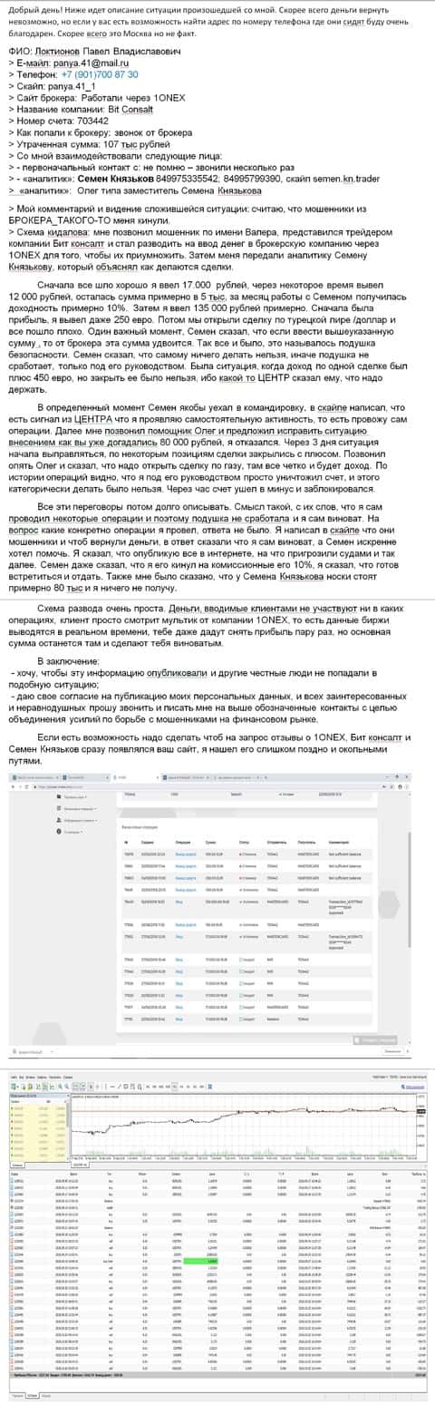 Брокерская контора BitConsult, которая работает через свою компанию 1ONEX. Схема была продумана заранее и сначала позвонил консультант и предложил вложить 17 000 рублей. Торговля проходила успешно и компания даже выплатила 12 000 рублей, это сделано для втирание в доверие. Клиенту понравилась доходность и он решил вложить 135 000 рублей. И снова все пошло в прибыль и мошенники позволили вывести 250 евро. Потом не все было гладко и тут сделка пошла в минус и один из помощников аналитика позвонил и попросил вложить еще 80 000 рублей для страховки маржи. Клиент отказался и ситуация выравнялась. Контора предложила еще раз открыть стопроцентную сделку по газу и прибыль точно будет. Уже через час сделка ушла маржин-колл и заблокировали аккаунт. Естественно во всем обвинили клиента, так как якобы он совершал какие-то сделки и довел счет до минуса.