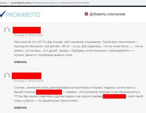 Как заявляет одна кинутая женщина в дилинговой конторе Бит Консульт работают профессионалы мошеннического дела. Женщина вложила деньги в компанию, но один из трейдеров, который вел торговлю заболел и умер (ну так постоянно случается у мошенников).